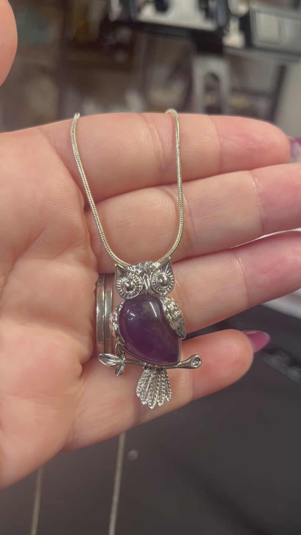 Amethyst Owl Necklace with 20” chain! Pendant is 1.5”x1”.