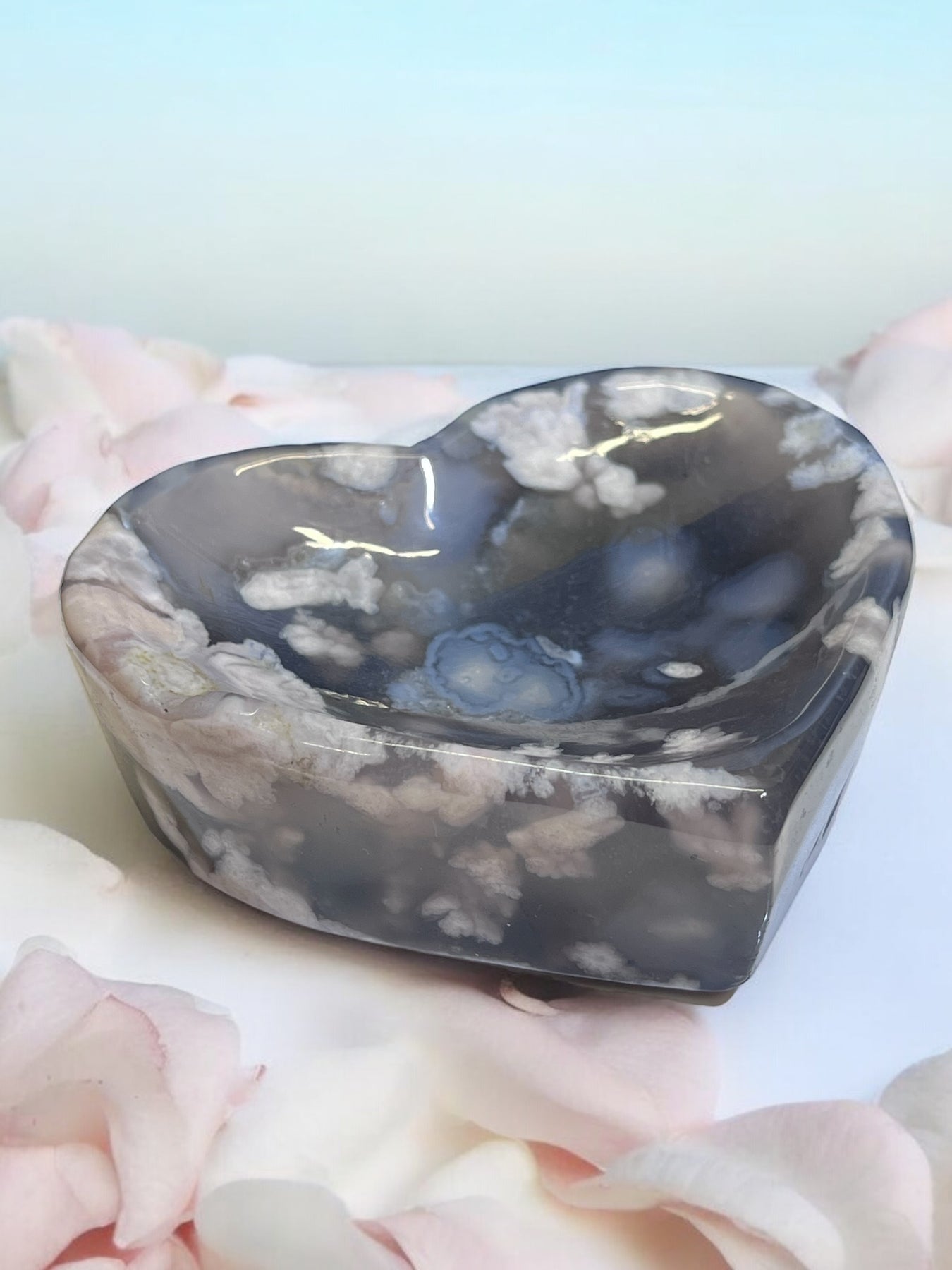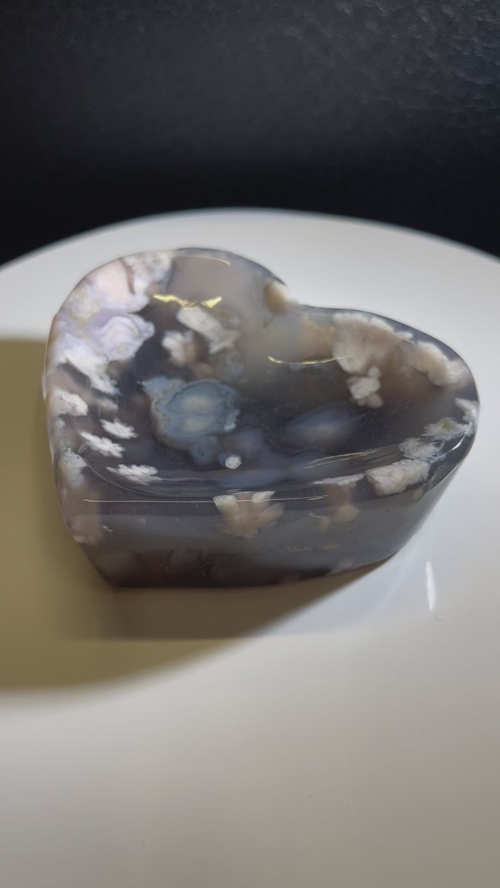 Beautiful Black Flower Agate Heart Bowl with stunning flower plumes. Approximately 3” useable diameter perfect for tumbled stones and jewelry!