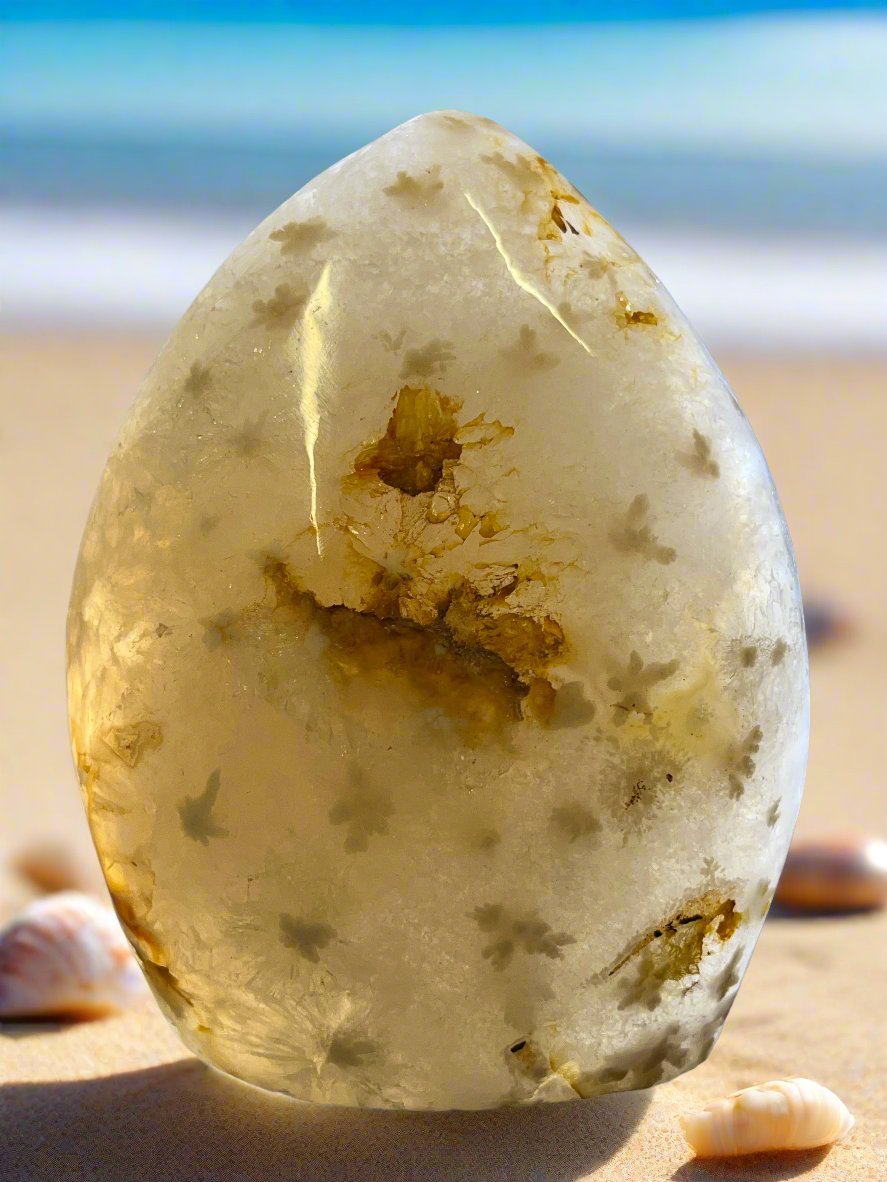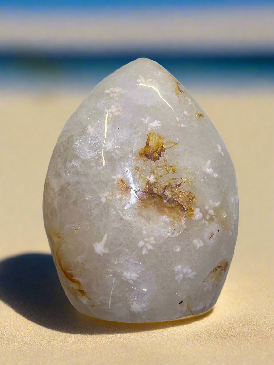 Flower agate is a powerful symbol of new beginnings, healing, and self-love. It is thought to empower individuals to rediscover joy and embrace life fully after overcoming challenging times. Let the calming energy of flower agate guide you on your journey to renewal and happiness.