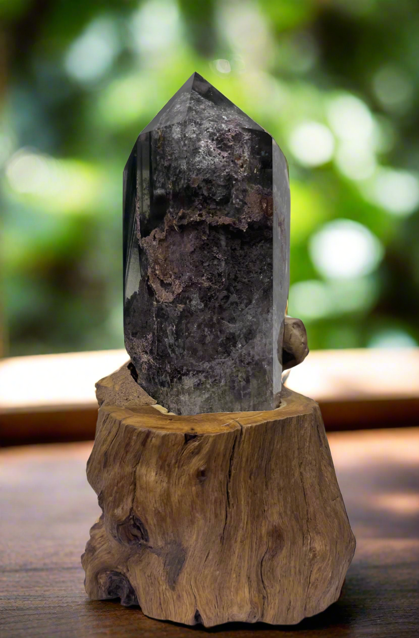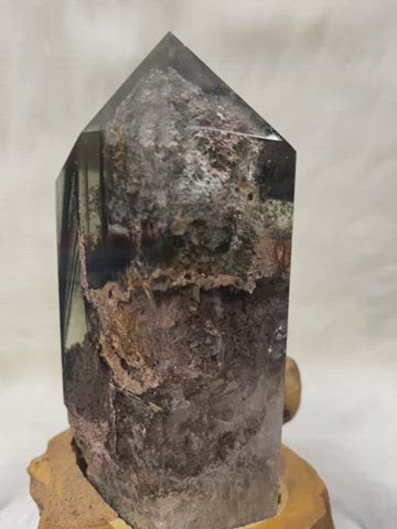 Absolutely stunning Garden Quartz Freeform with real wood custom made stand. This beauty features exquisite clarity that really shows the world within. Combinations of green and red garden throughout and has stellar phantoms. Weighing approximately 2.535lbs with stand, 1.740 without stand and stands about 8” tall with stand. Ask to see me on the live show. Video attached!
