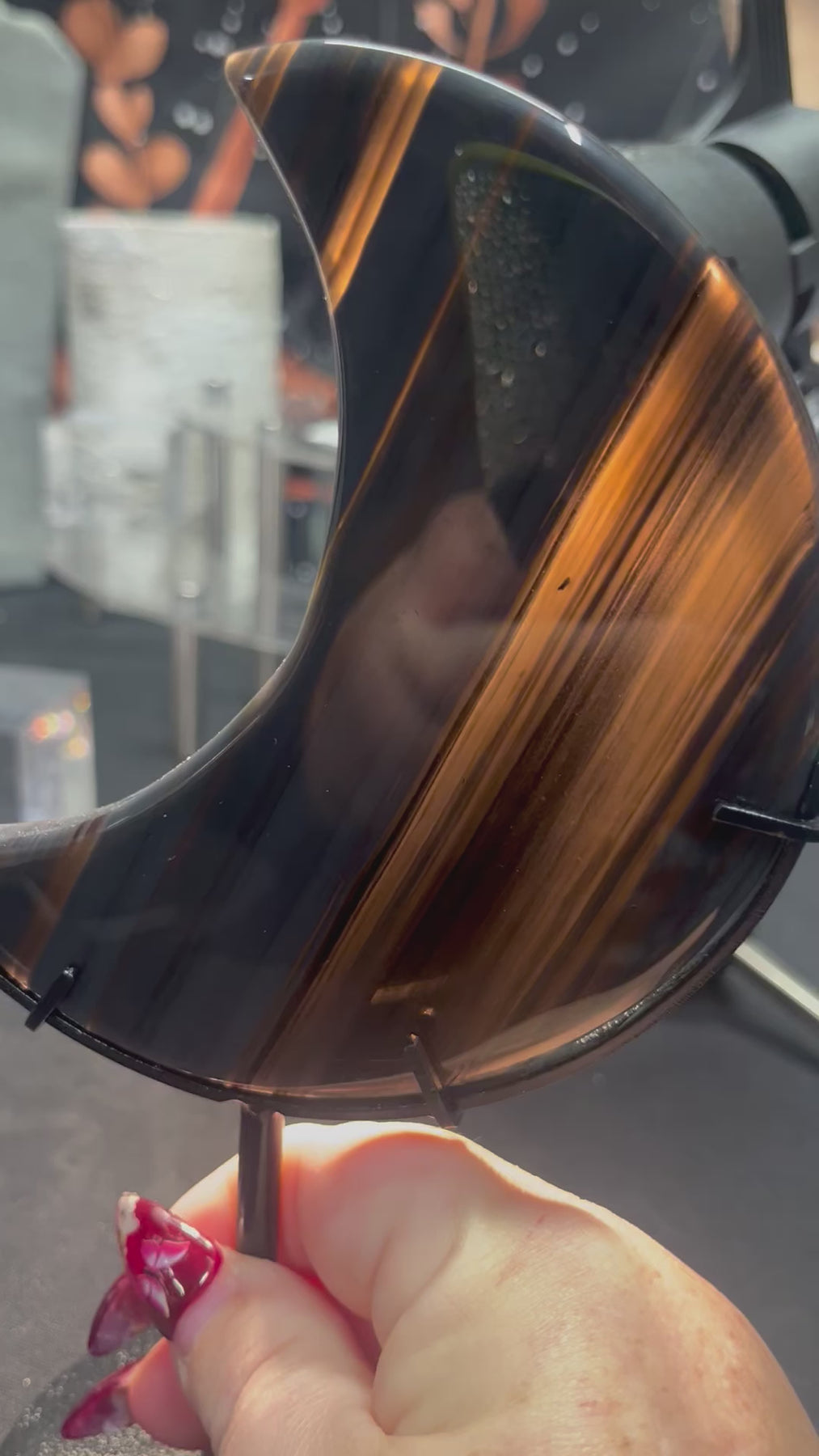 Phantom Obsidian Moon with metal stand included. Approximately 5 inch moon and stands 8.5” tall.