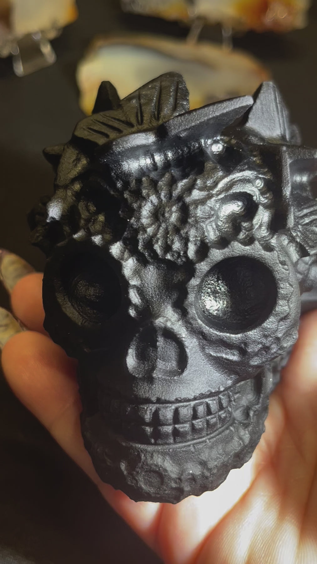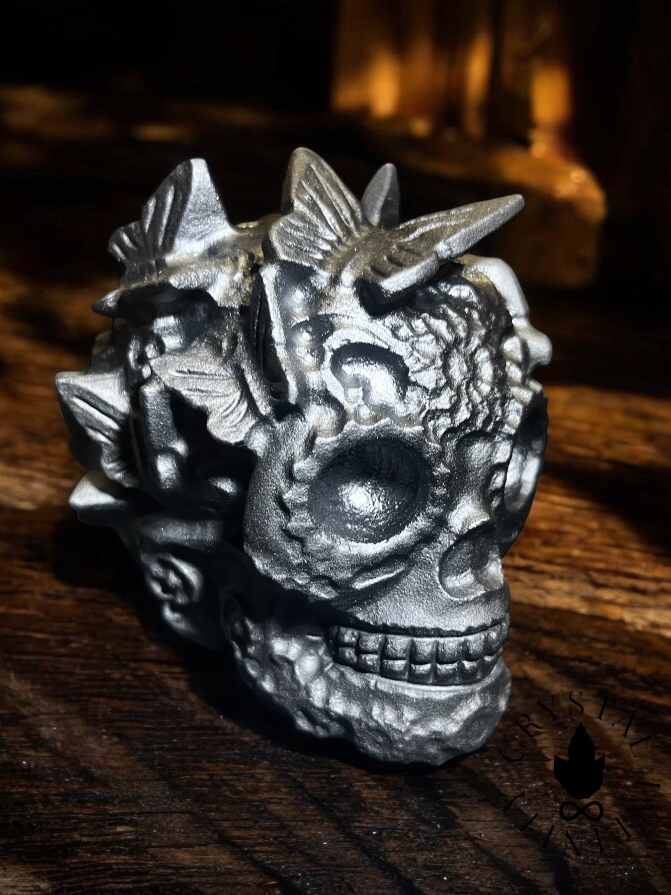 Unique Obsidian Sugar Skull with Butterflies! Weighs approx 1lb and 3.5 inches.