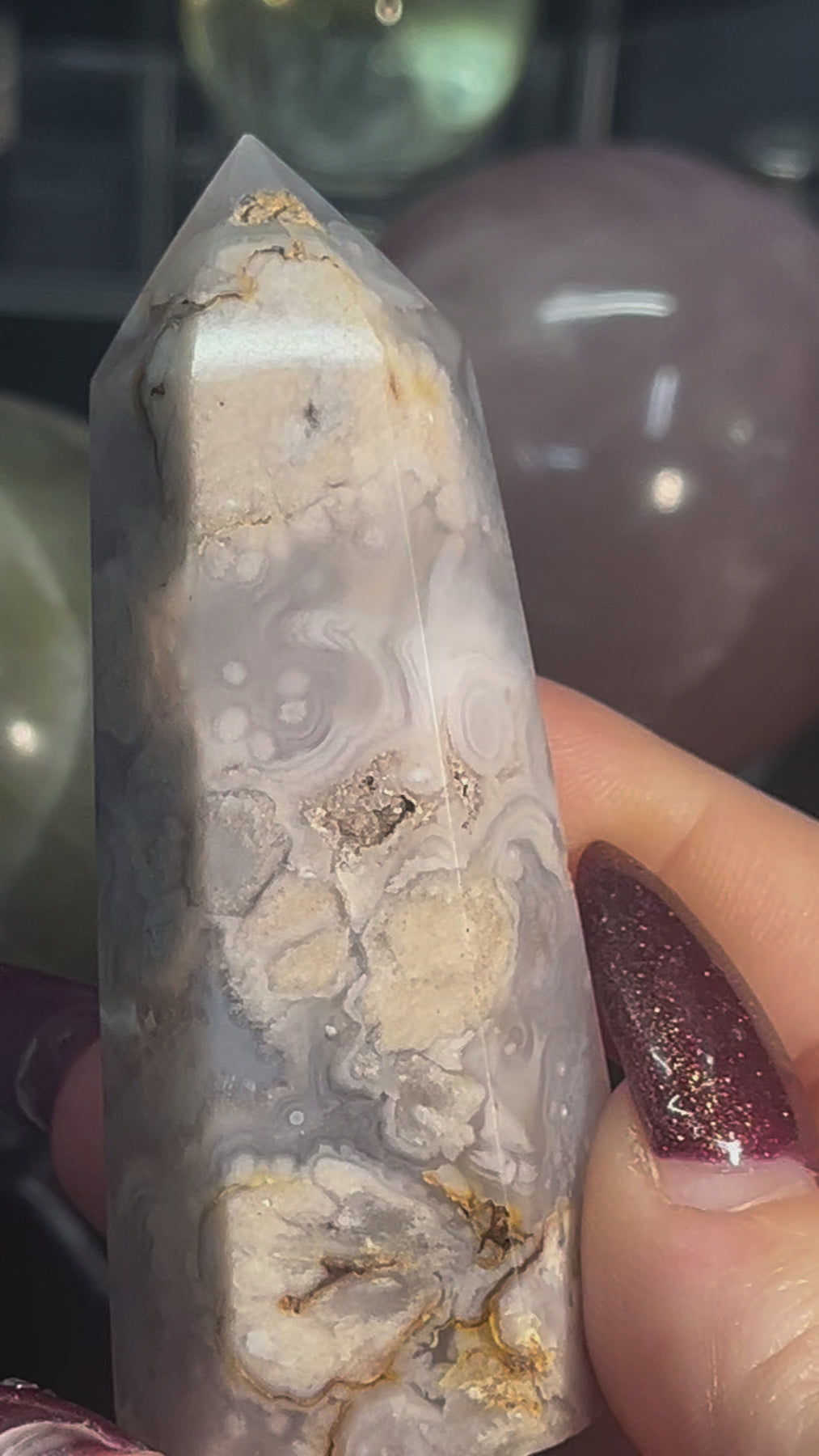 Flower Agate Point featuring beautiful plumes. Approximately 3.5 inches and 85 grams.