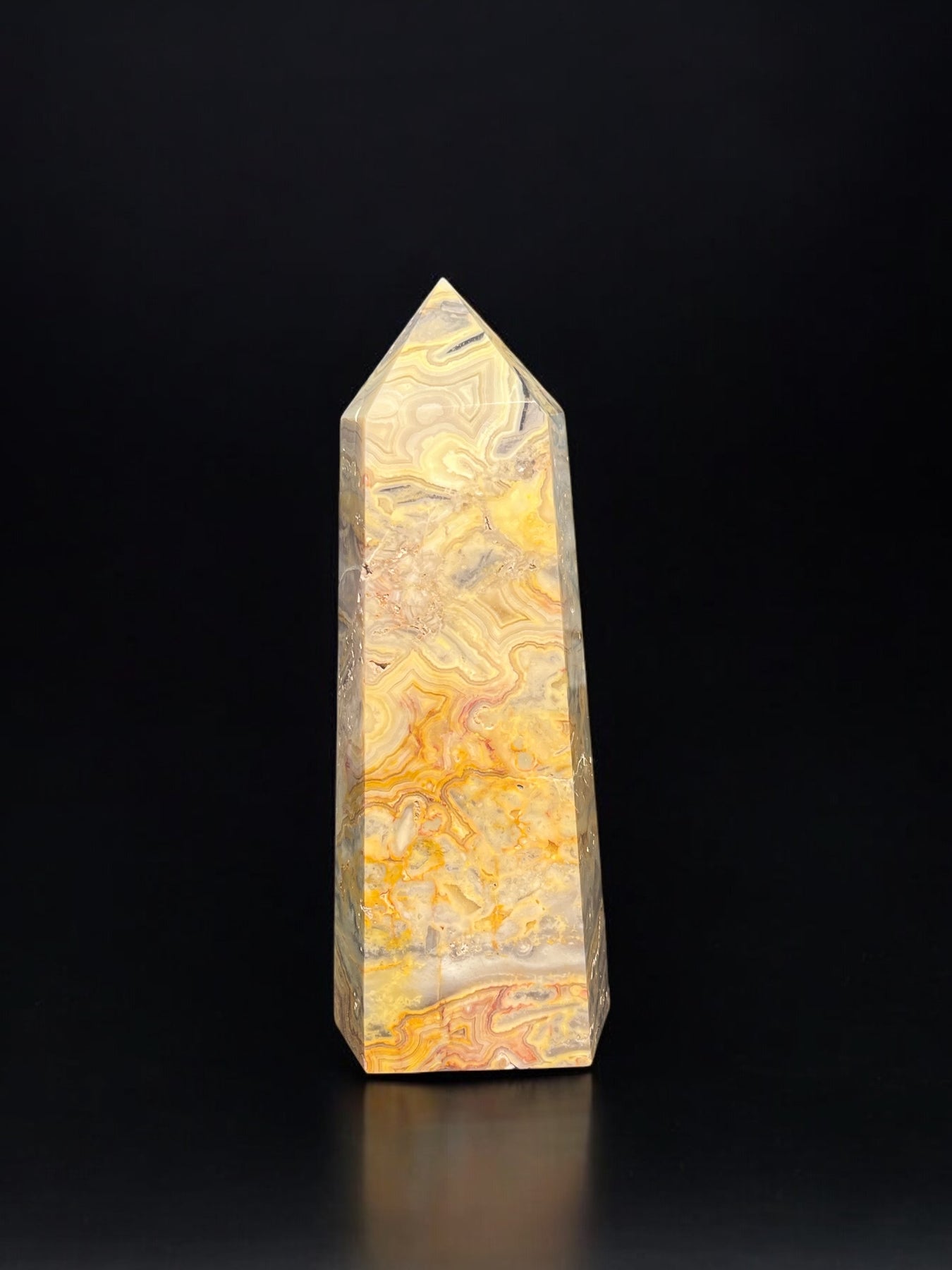 Beautiful Crazy Lace Agate tower with all the stunning markings and vibrant colors! Standing appropriately 6.5” tall and weighing .795kg! Check out my video!