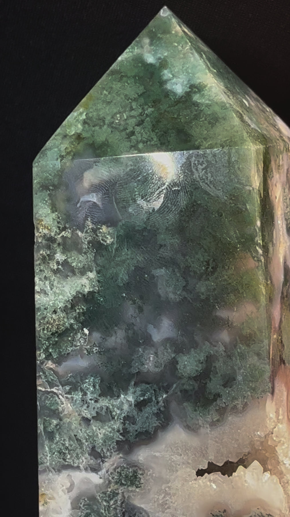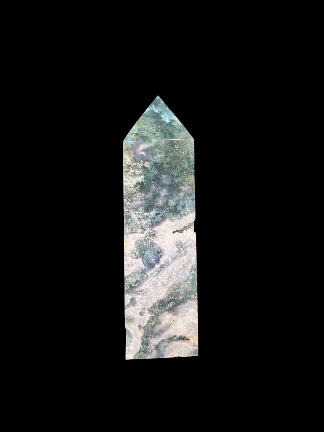 Moss Agate Tower approximately 7.5 inches tall and 1.8 lbs!
